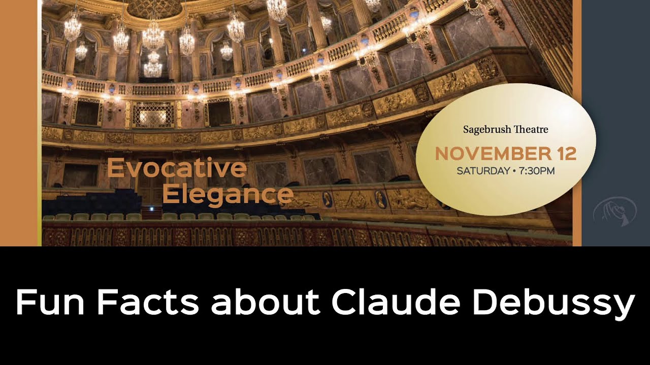 In preparation for our next concert, Evocative Elegance, on November 12, 2022, we’ve put together some fun facts about composer Claude Debussy. We’ll be performing his Prélude à l’après-midi d’un faune (Prelude to the Afternoon of a Faun.