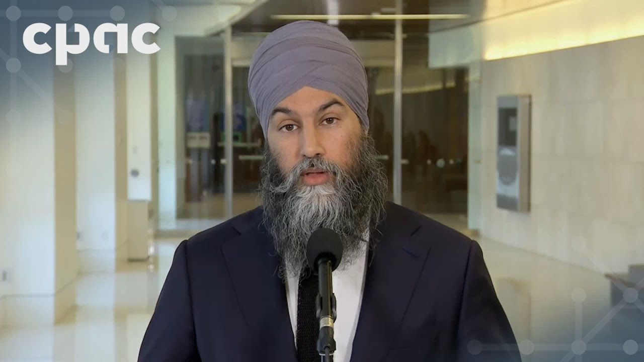 On Parliament Hill in Ottawa, NDP Leader Jagmeet Singh takes questions from reporters after attending a strategy planning session with his caucus.