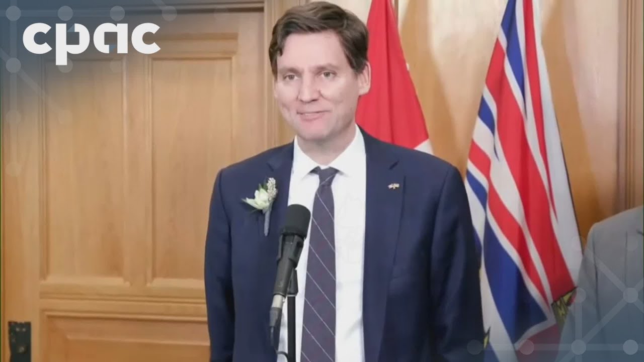 David Eby, the premier of British Columbia, speaks with reporters in Victoria following the delivery of the speech from the throne outlining his government’s legislative priorities. He is joined by government House leader Mike Farnworth.