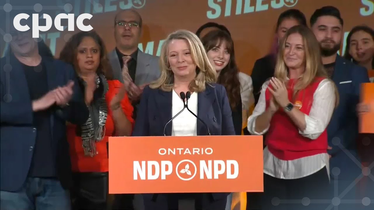 Marit Stiles, the leader of the New Democratic Party of Ontario, delivers an election-night address to supporters in Hamilton.