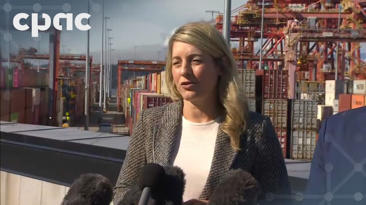 Foreign Affairs Minister Mélanie Joly speaks with reporters during a visit to the Port of Vancouver.