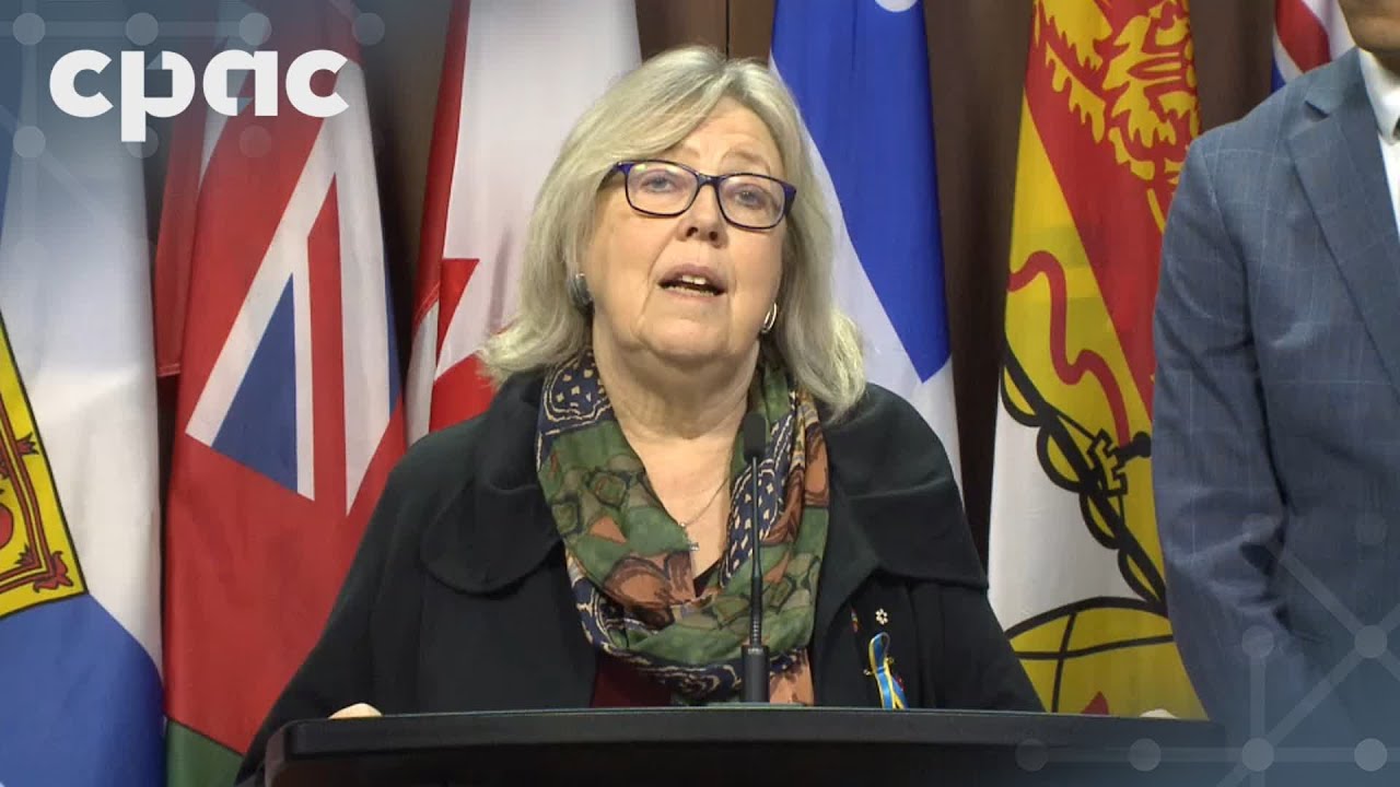 At a news conference in Ottawa, Green Party co-leaders Elizabeth May and Jonathan Pedneault call for Canada’s progressive political parties to co-operate more to prevent Conservative gains from vote-splitting.