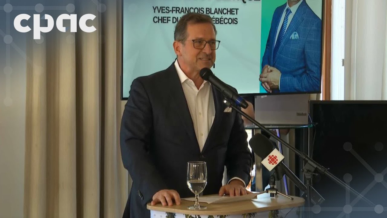 Le chef du Bloc Québécois Yves-François Blanchet prononce un discours portant sur sa vision de l’avenir économique et commercial du Québec dans le contexte de la guerre tarifaire entre le Canada et les États-Unis.
