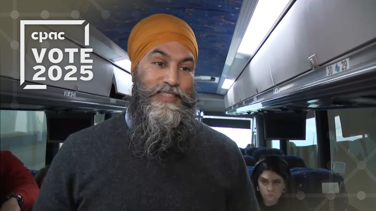 Speaking with reporters aboard his campaign bus en route from Montreal to Toronto, NDP Leader Jagmeet Singh responds to reports that Liberal Leader Mark Carney will not take part in a French-language debate proposed by the TVA network.