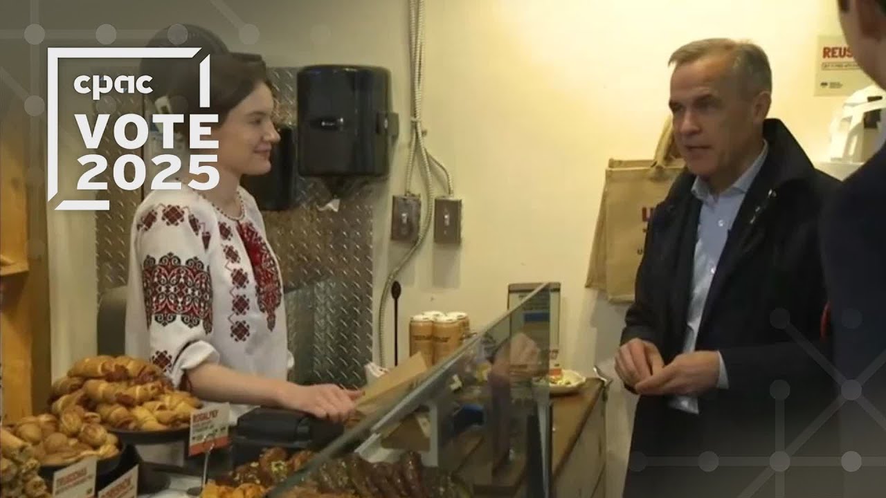 Liberal Leader Mark Carney makes a campaign stop at a Ukrainian bakery. He is accompanied by Jake Sawatzky, the Liberal candidate for New Westminster–Burnaby–Maillardville, B.C.