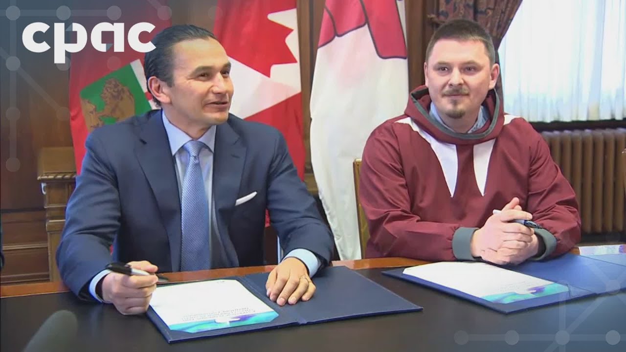 Manitoba Premier Wab Kinew and Nunavut Premier P.J. Akeeagok take questions from the press in Winnipeg after signing a joint statement on an energy corridor.