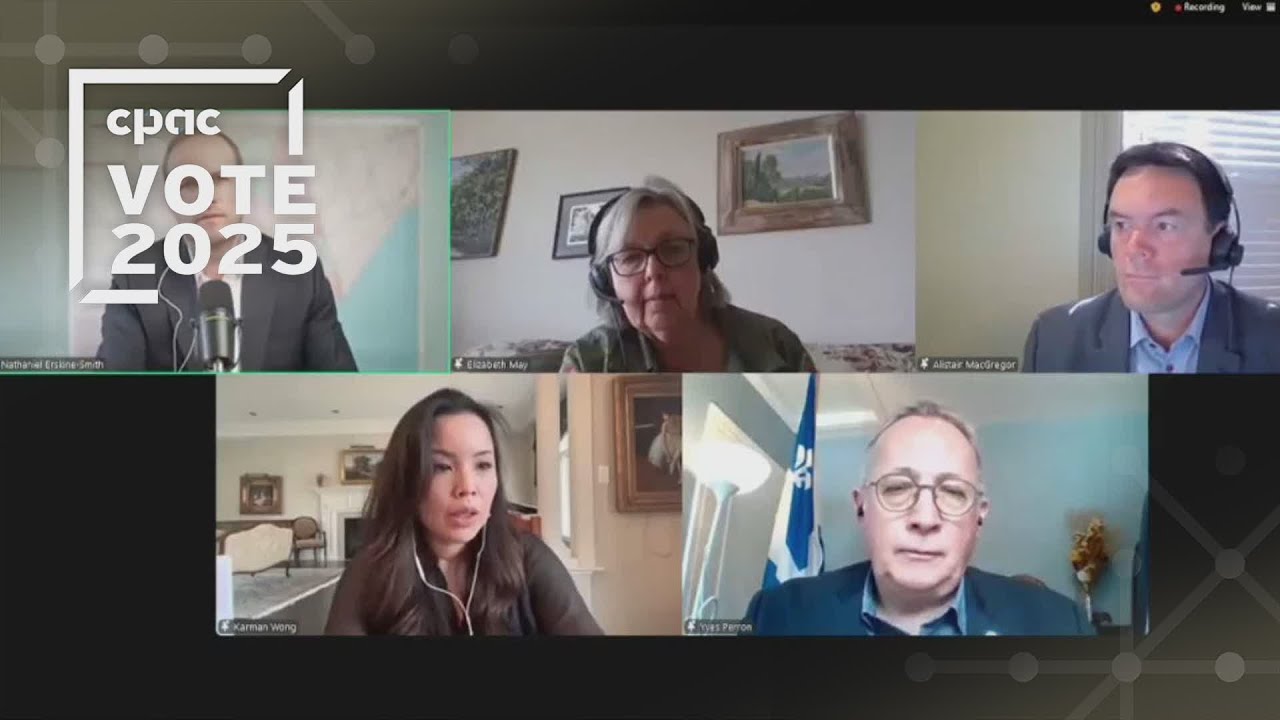 Federal party candidates Nathaniel-Erskine Smith (Liberal), Alistair MacGregor (NDP), Elizabeth May (Green Party) and Yves Perron (Bloc Québécois) take part in a debate on animal protection issues.