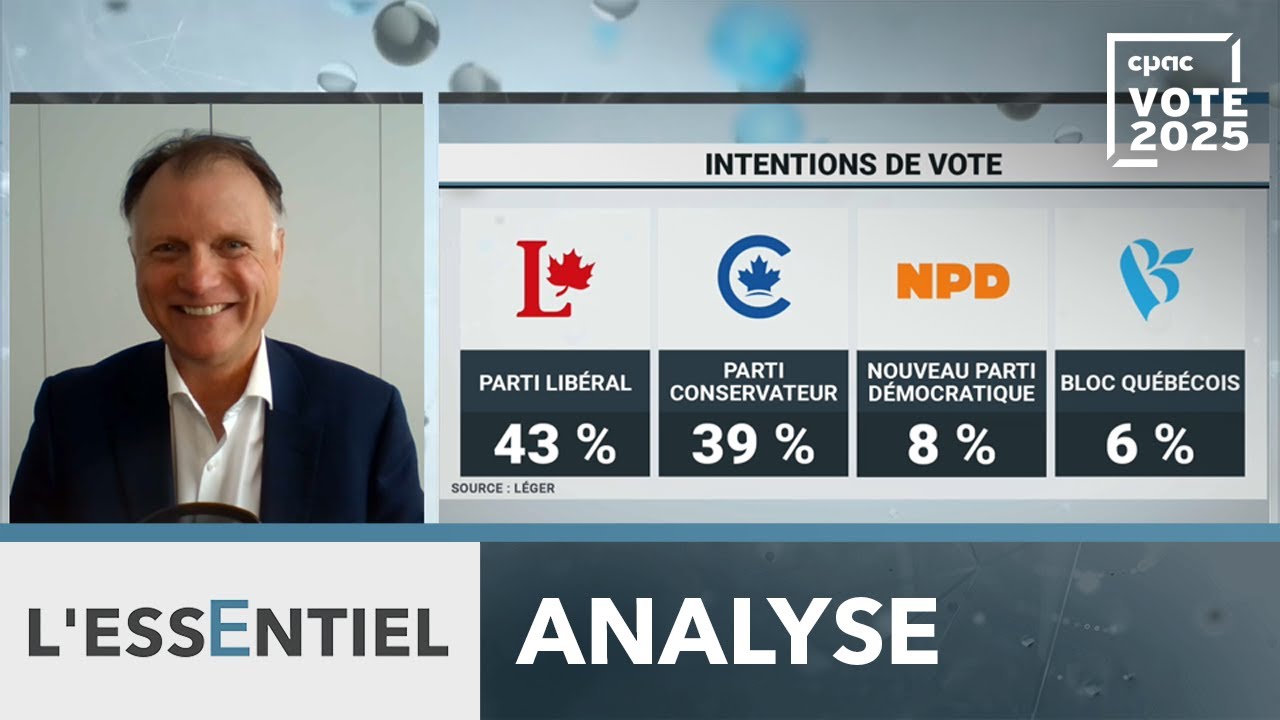 Les intentions de vote au niveau national restent à peu près inchangées dans le nouveau sondage Léger, qui attribue 43 % au Parti libéral et 39 % au Parti conservateur. De plus, 55 % des Canadiens et 66 % des Québécois affirment croire que Mark Carney sera élu premier ministre, peu importe leur préférence. Notre animatrice Catherine Lafrance en discute avec Jean-Marc Léger, président de la firme de sondages Léger.