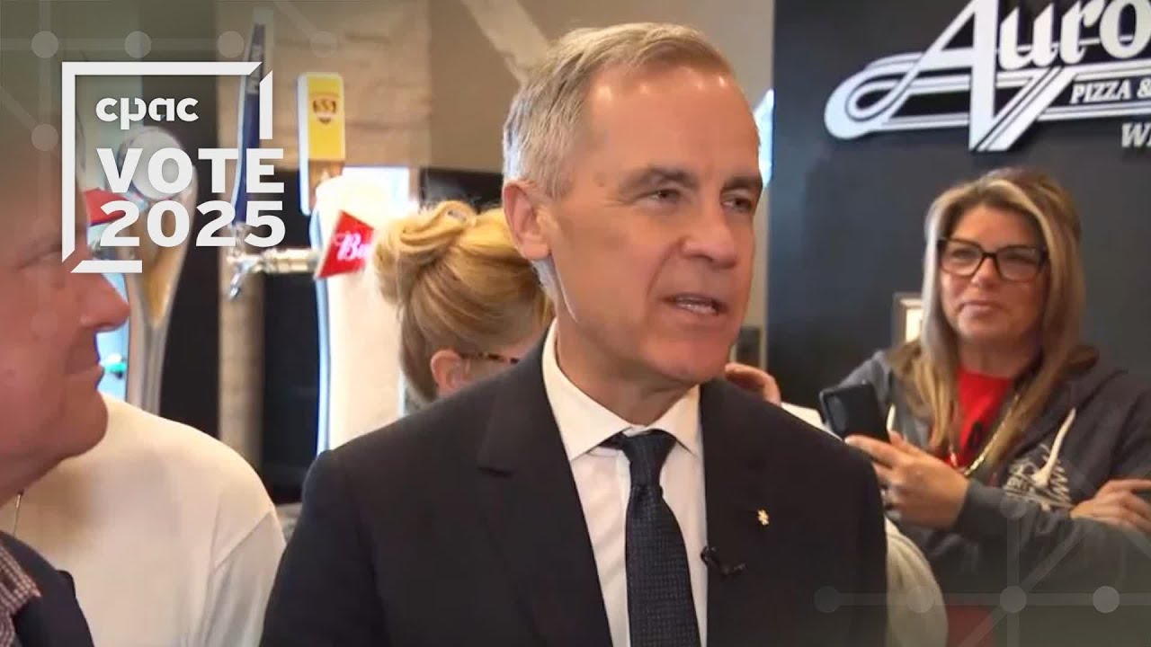 Liberal Leader Mark Carney campaigns in the northern Ontario city of Sault Ste. Marie, where he greets supporters at a local pizza restaurant. The whistle stop comes days before the April 28 federal election.