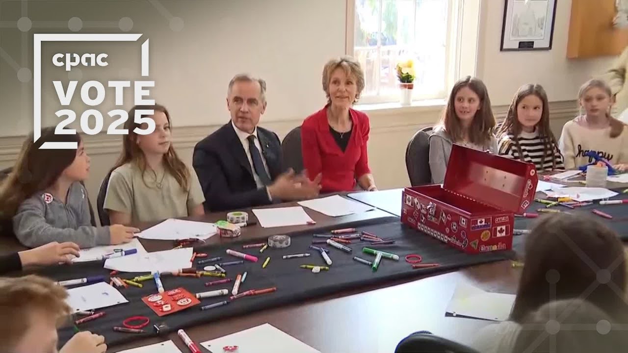 Liberal Leader Mark Carney visits with students making a time capsule in Georgetown, Ontario. He is joined by his wife Diana Fox Carney.