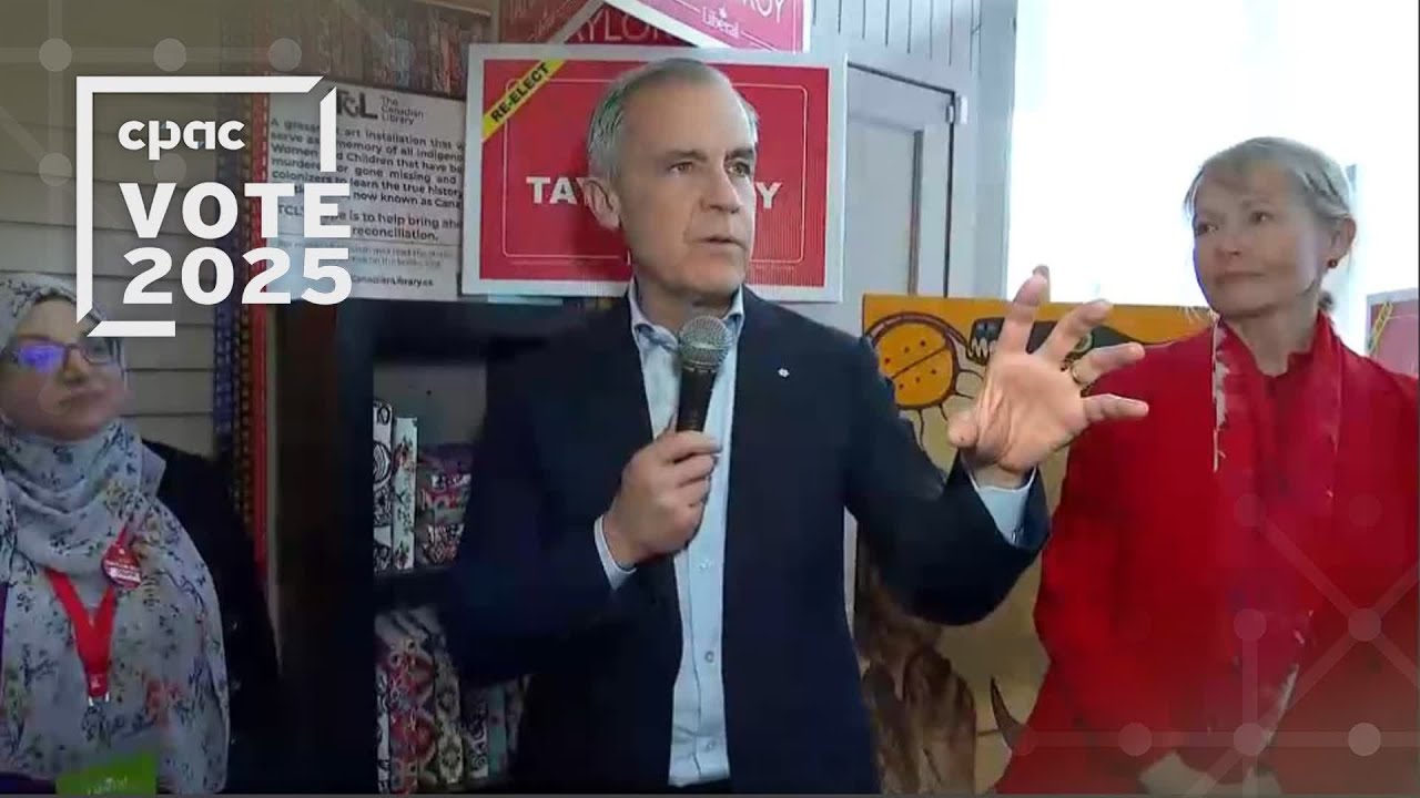 Liberal Leader Mark Carney makes a campaign stop and addresses supporters at an art gallery in Aurora, Ontario.