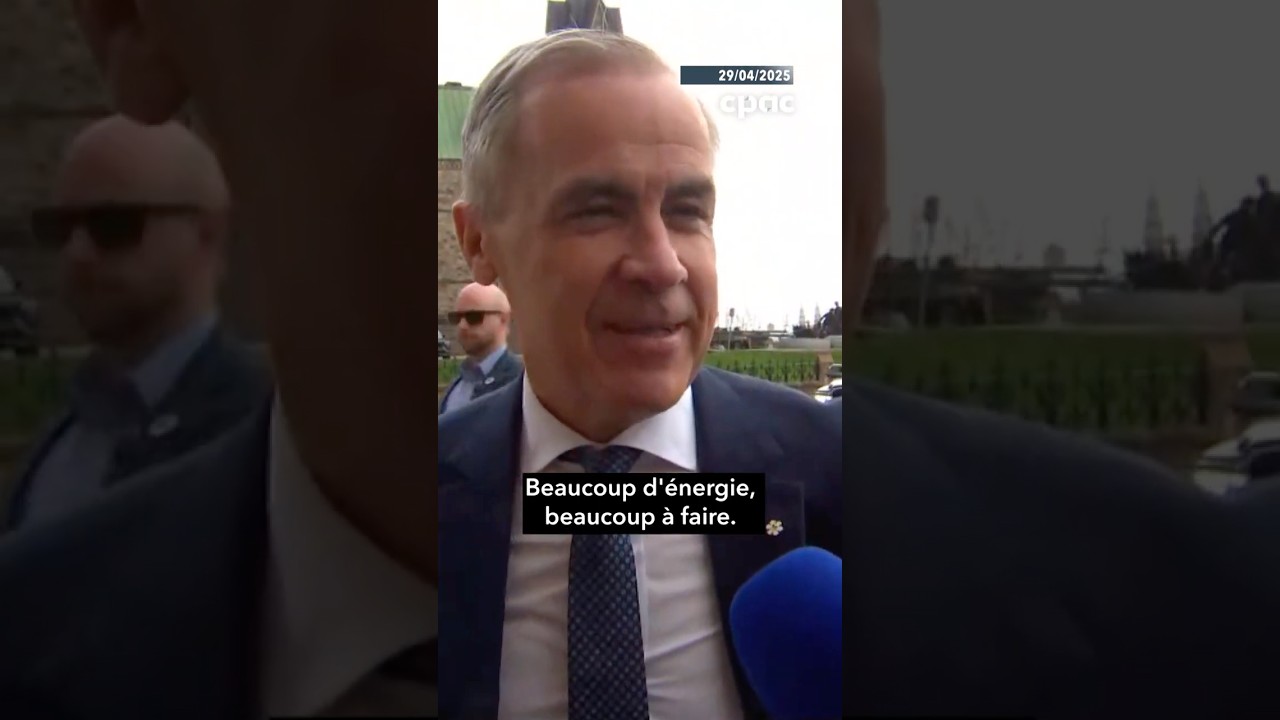 À son arrivée au Bureau du premier ministre au lendemain de l’élection générale, le chef libéral Mark Carney déclare à des journalistes avoir « beaucoup d’énergie, beaucoup à faire. » Il répond à ces questions alors qu’il reste à savoir si le gouvernement qu’il formera sera majoritaire ou minoritaire.