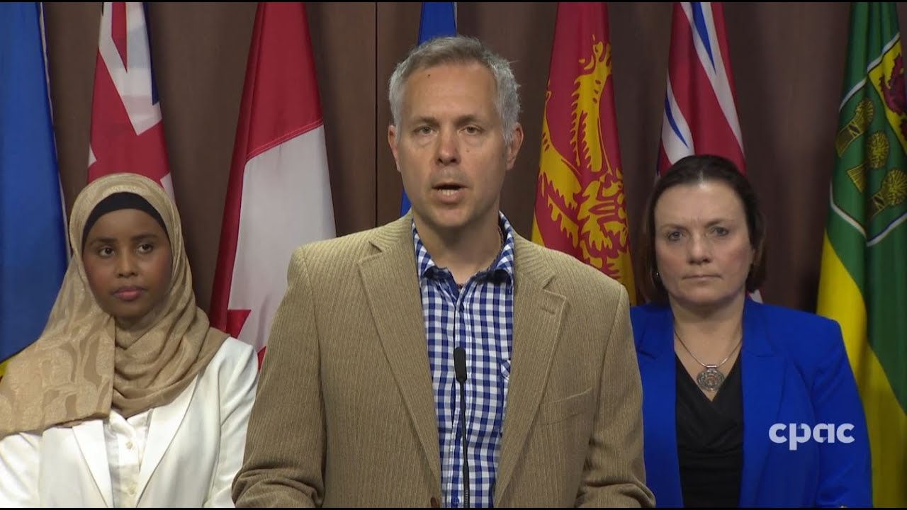 Speaking with reporters are Taryn Russell (executive director of Results Canada) and Susan McIsaac (president and CEO of Right to Play International), who are co-chairs of the Canadian International Education Policy Working Group. Also speaking are Hawa Abdiaziz (gender equality specialist at the Refugee Education Council), Shelly Whitman (executive director of the Dallaire Institute for Children, Peace, and Security), and Fred Witteveen (CEO of Children Believe).