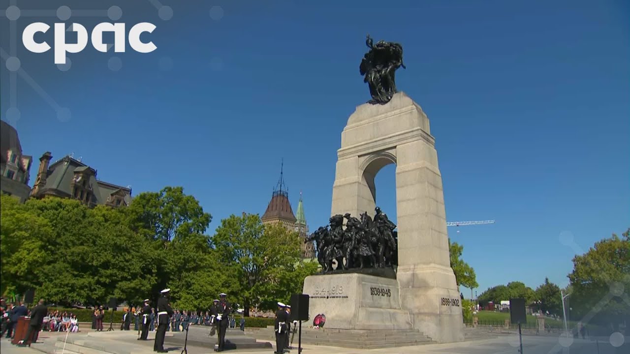 At the National War Memorial in Ottawa, a ceremony is held to commemorate the 25th anniversary of the entombment of Canada’s Unknown Soldier. Governor General Mary Simon delivers remarks alongside representatives from the Royal Canadian Legion and other dignitaries.