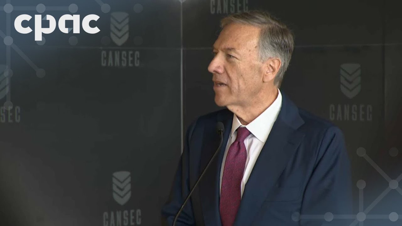 Former U.S. secretary of state Mike Pompeo takes questions from reporters after speaking at CANSEC, an annual defence and security trade show in Ottawa.