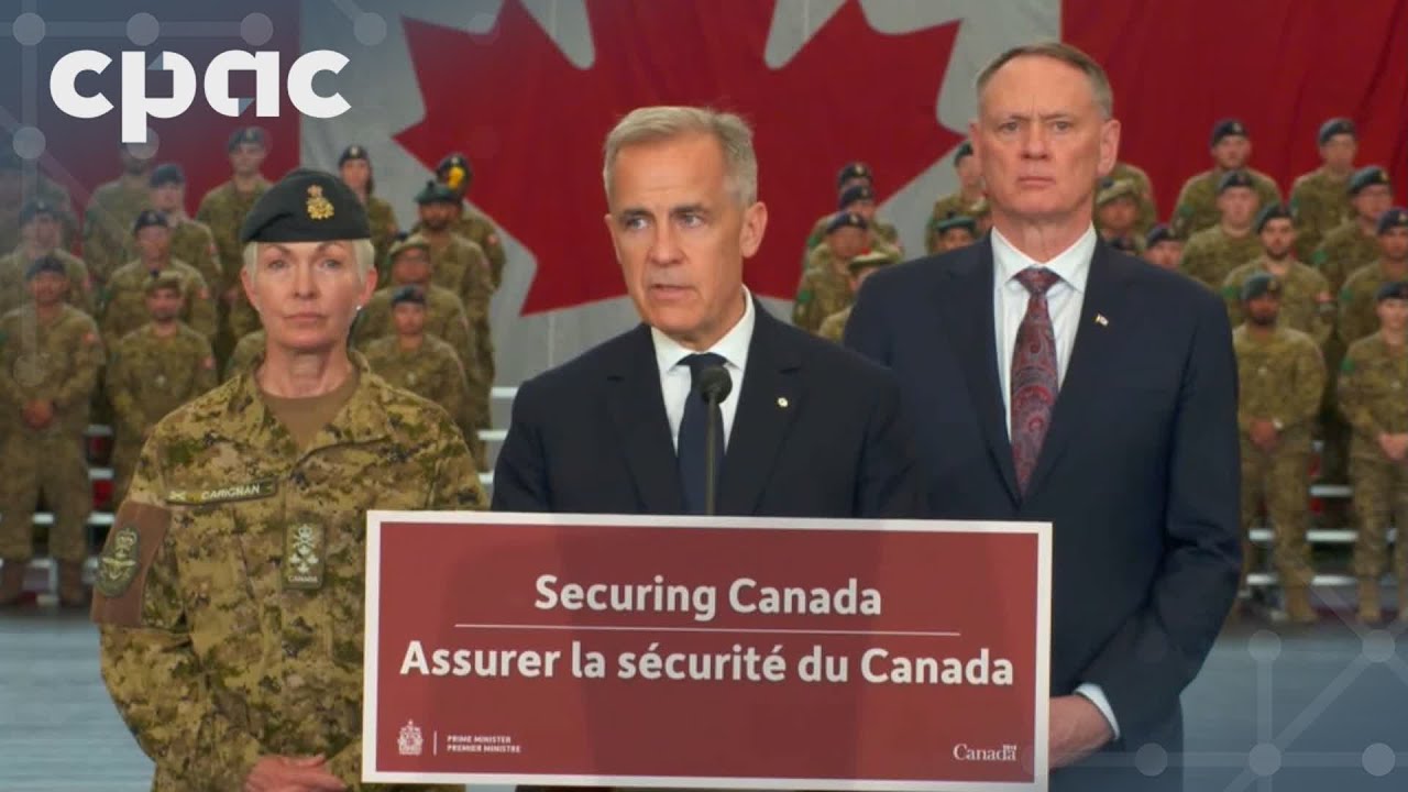PM Mark Carney speaks with reporters in Toronto after touring a military facility.