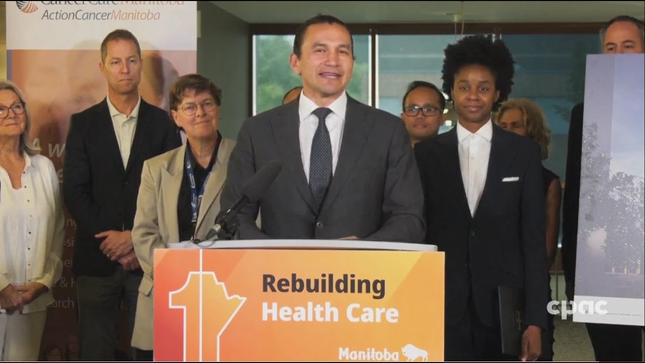 Premier Wab Kinew holds a news conference in Winnipeg to announce an investment in CancerCare Manitoba. He is joined by Uzoma Asagwara, the provincial minister of health, seniors and long-term care, and Dhali Dhaliwal, the former president and CEO of CancerCare Manitoba.