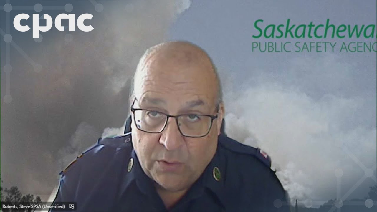 At a news conference in Regina, officials from the Saskatchewan Public Safety Agency (SPSA) discuss the wildfire situation in the province. Speaking are Steve Roberts (vice president, operations division) and Marlo Pritchard (president and fire commissioner).