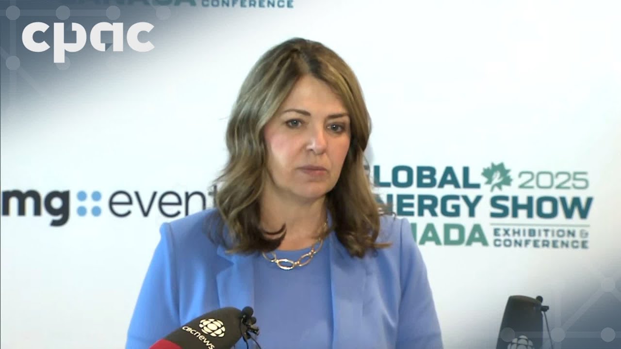 Alberta Premier Danielle Smith takes questions from reporters following her keynote address at the Global Energy Show in Calgary.