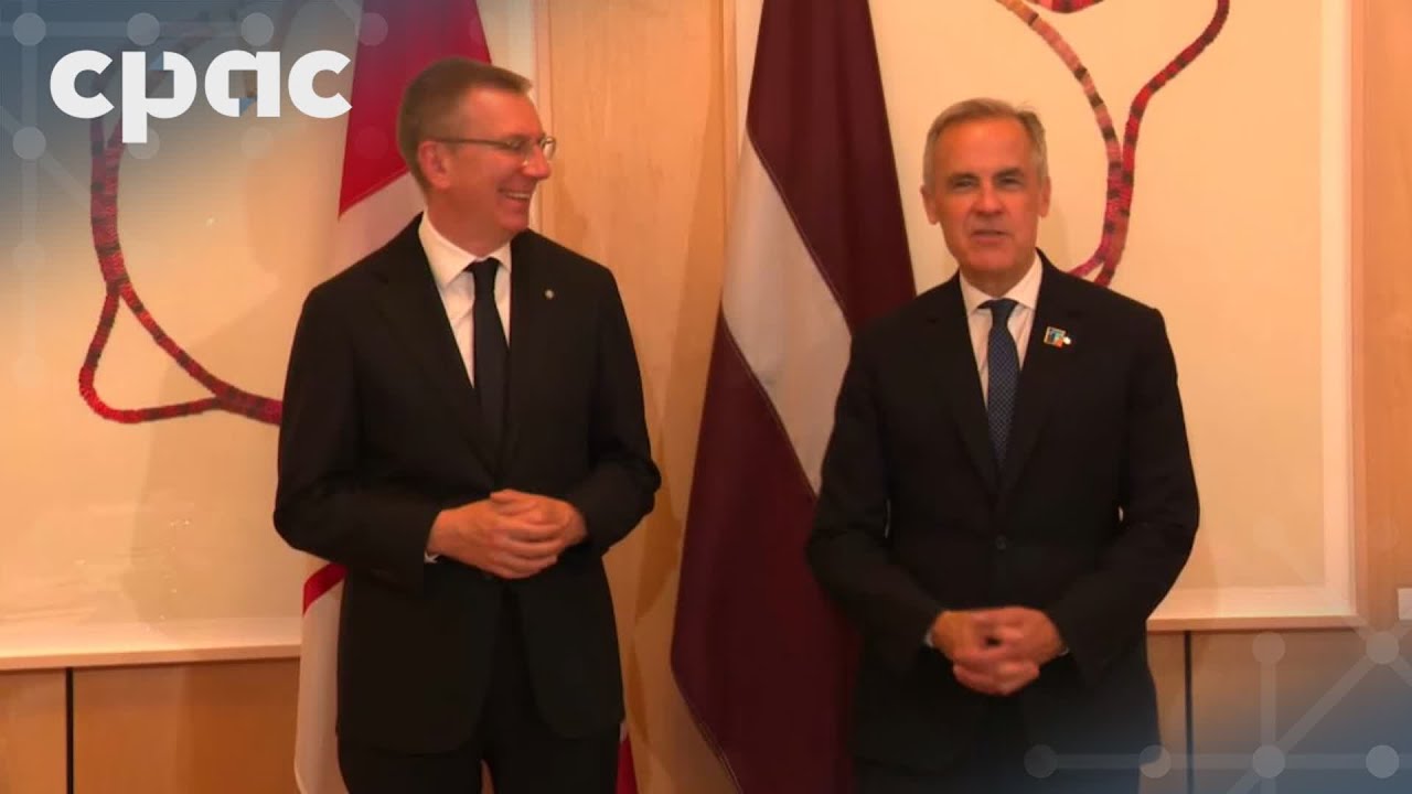 Prime Minister Mark Carney and Edgars Rinkēvičs, the president of Latvia, comment briefly ahead of their bilateral meeting in The Hague, Netherlands. The Canadian prime minister is in the Netherlands to attend the 2025 NATO Summit.