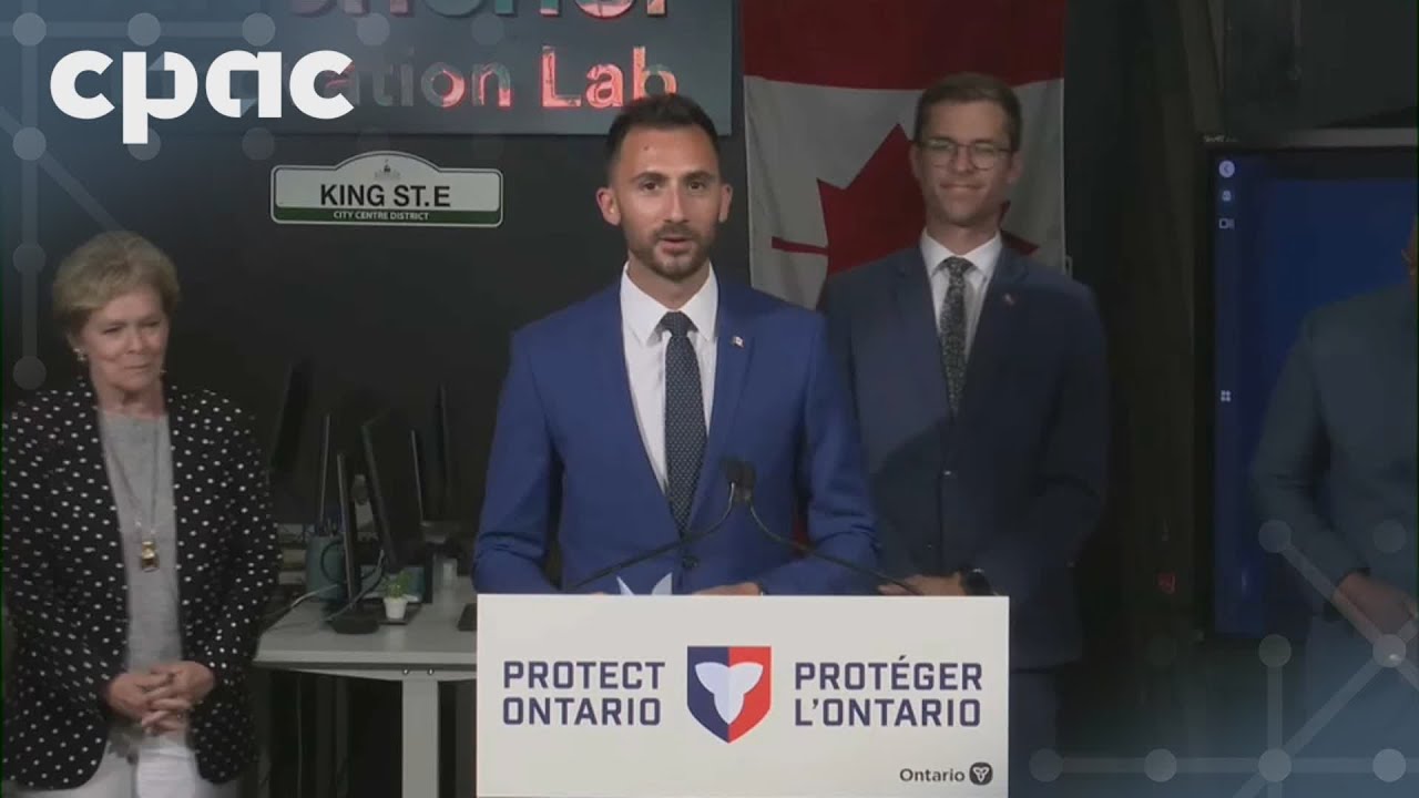 Stephen Lecce, the Ontario minister of energy and mines, holds a news conference in Kitchener. He is joined by Sam Oosterhoff, the associate minister of energy intensive industries.