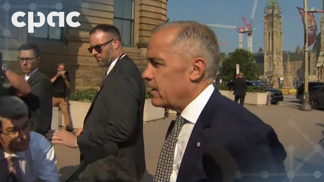 Prime Minister Mark Carney speaks briefly with reporters on Parliament Hill before chairing a virtual cabinet meeting. He discusses his government’s ongoing negotiations with the Trump administration to end the months-long Canada-U.S. trade war.