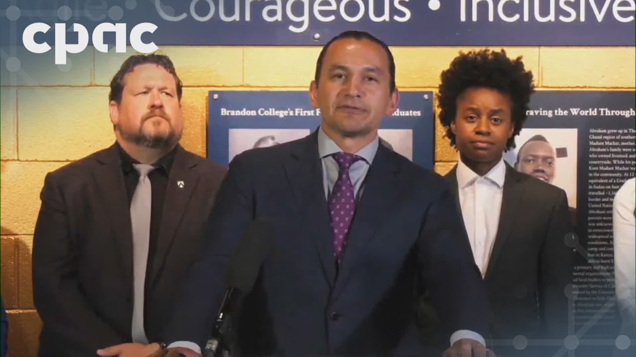 Manitoba Premier Wab Kinew holds a news conference at Brandon University to discuss health-care training.
