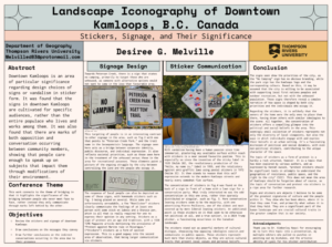 The last academic poster which brings it all together for me is Landscape iconography of downtown Kamloops, B.C., Canada: Stickers, signage, and their significance (Melville, 2025) where the author examines how informal signage and stickers reflect power, resistance, and communication in public space. How moving is this simple phrase from Desiree: “This work connects to the theme of bridging in that it highlights the significance of the bridging between people who never meet face to face, rather instead they only communicate through marks left behind by the other” (Melville, 2025). The author so cleverly begins with the No Camping sign vis-à-vis a Xget’tem’ Trail sign, as we, so comfortably settled on unceded territories, have so much to say about how the space should be occupied, who belongs, and what norms they should conform to.