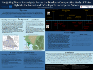 Another poster provides important context for how we think about water while cities continue to plan and make decisions. Navigating water sovereignty across the border: A comparative study of water rights in the Lummi and Tk’emlúps te Secwépemc Nations (Denton & Guariento, 2025) examines how colonial legal frameworks on either side of the Canada–U.S. border shape the recognition and exercise of Indigenous water rights. The research finds that, despite different legal contexts, both nations continue to face persistent challenges in asserting their inherent water rights, with water governance and environmental sustainability remaining unresolved policy issues.