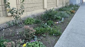 We faced a number of challenges, including how to mulch the garden, as wood chips would have been a fire hazard—especially considering the cigarette butts we found on the site while preparing for planting. We also did not want to use rocks, for a variety of reasons, so we chose green mulch, planting various ground covers, including strawberries, instead.